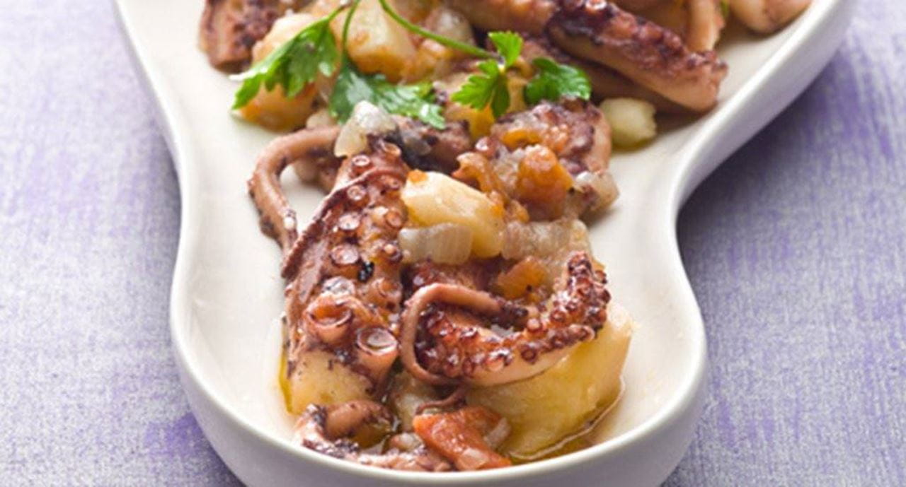 - Escorra o polvo, corte-o em pedaços e junte-o aos restantes ingredientes.