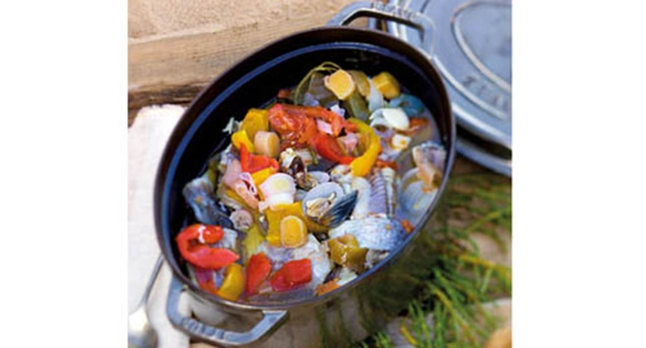 - Disponha metade dos legumes preparados em camadas pela seguinte ordem: cebola, alho francês, tomate e pimentos. Salpique levemente cada camada de legumes com uma pitada de sal e por cima disponha os peixes numa só camada. Junte o ramo de salsa e louro e a malagueta de piripiri. Regue com o vinho branco e termine com os restantes legumes, dispostos em camadas pela mesma ordem. Regue generosamente com Vaqueiro Líquida, tape e leve a cozinhar sobre lume muito brando durante cerca de 40 minutos após levantar fervura. De vez em quando agite o tacho, mas não mexa com a colher.