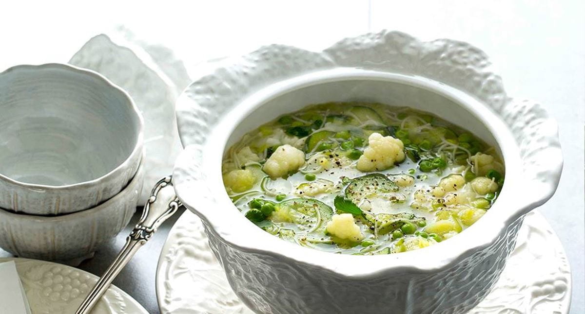 Caldo de couve-flor com courgete e ervilhas