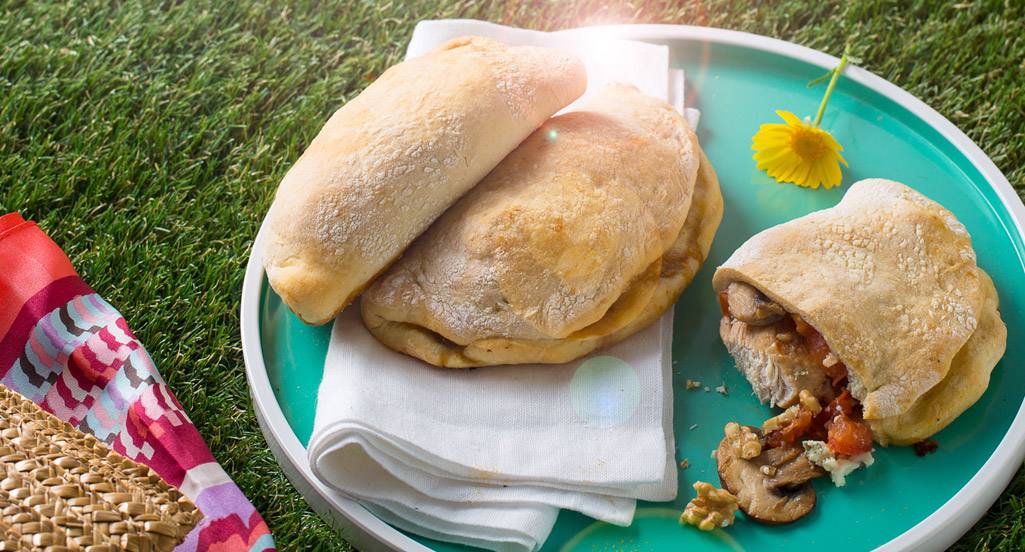- Coloque 1/6 da mistura de cogumelos e tomate sobre metade do círculo de massa, salpique com 1/6 do miolo de noz, grosseiramente picado, e por cima disponha os peitos de frango. Regue com um pouco do molho que ficou na frigideira e cubra tudo com a parte disponível da massa. Dobre as bordas da massa para cima de modo a fechar bem o calzonne e coloque-o sobre o tabuleiro do forno forrado com papel vegetal. Pincele a superfície com Vaqueiro Líquida e leve ao forno durante cerca de 25 minutos.