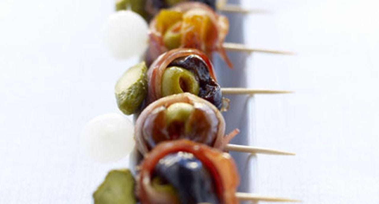 - Tire o caroço às ameixas e às tâmaras e abra os alperces ao meio. Introduza uma azeitona em cada um dos frutos secos e enrole-os em fatias finas de bacon. Prenda com um palito.