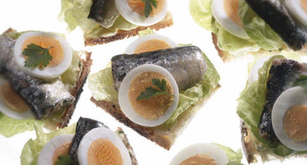- Lave e enxugue bem as folhas de alface e coloque 2 a 2 sobre as fatias de pão barradas. Sobre estas disponha 2 sardinhas de conserva bem escorridas e intercale nestas 3 fatias de ovos cozidos cortados em fatias.