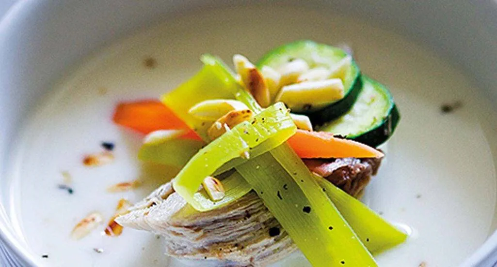 Canja de perdiz com mini legumes e amêndoas crocantes