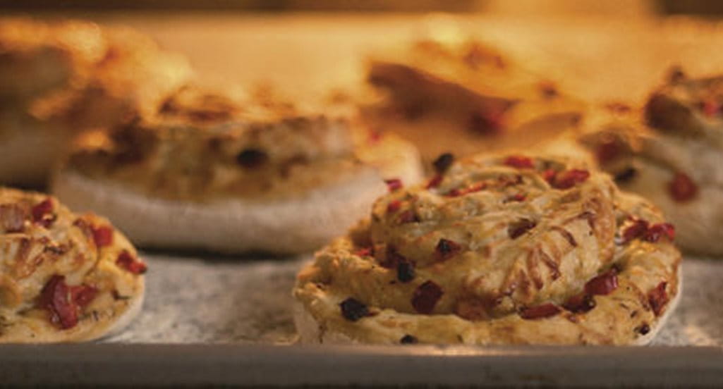 - Estenda a massa de pão com o rolo da massa sobre a mesa da cozinha enfarinhada. Espalhe o recheio de pimentos sobre a superfície da massa. Polvilhe com o queijo e perfume a gosto com uma erva aromática seca, tomilho por exemplo combina lindamente.