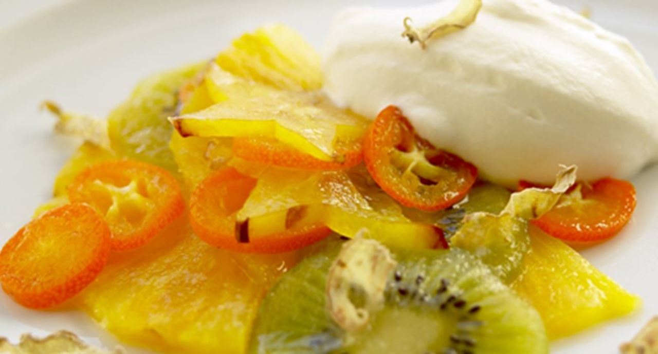 Carpaccio de frutos tropicais sobre mousse de gengibre