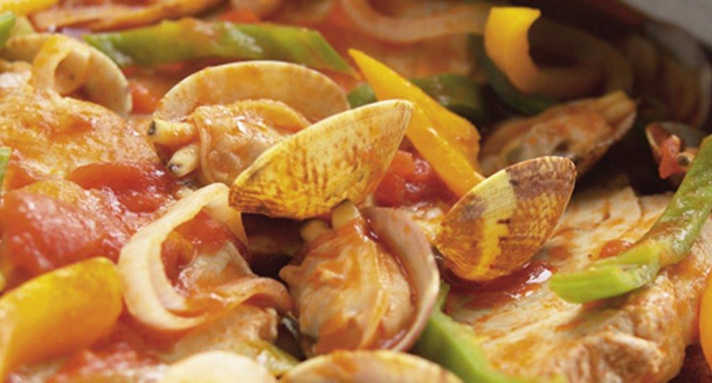 - Escorra as amêijoas, passe-as por água corrente e disponha-as sobre o fundo de uma cataplana grande.