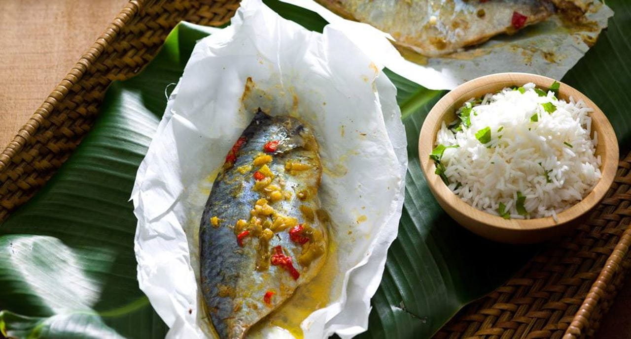 - 2 cavalas grandes *sal1 malagueta vermelha fresca1 malagueta verde fresca4 dentes de alhoraiz de gengibre6 colheres de sopa de molho de soja1 colher de sobremesa de açúcar mascavado 1/2 limãoVaqueiro Líquidaágua 300 g de arroz basmaticoentros