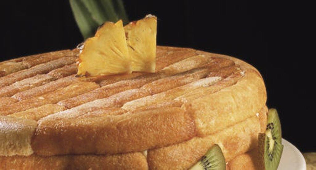 - Embeba os palitos de champagne a pouco e pouco na calda de ananás e forre o fundo e as paredes laterais de uma forma de mola com 22 cm de diâmetro (na parte lateral, coloque os palitos na horizontal e em camadas desencontradas, como se fosse um muro).