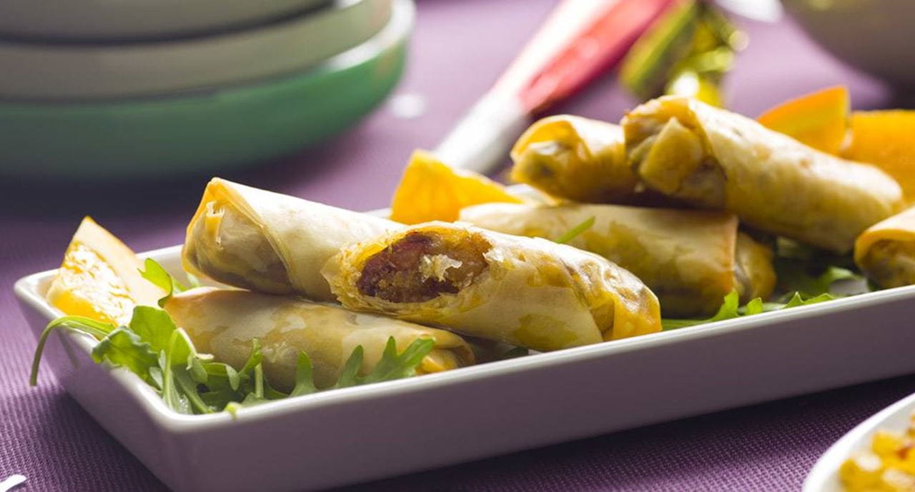 - 1 cebola pequena picada 20 g de Vaqueiro Clássica 1 dente de Alho 1 farinheira 1 laranja pimenta de moinho vinagre balsâmico 12 tâmaras 3 folhas de massa filo Vaqueiro Líquida rúcula