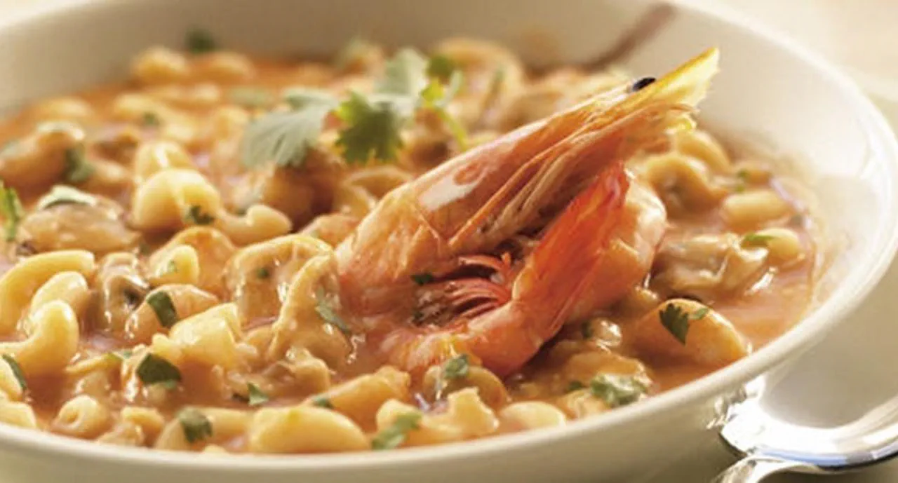 - Descasque e pique a cebola e os dentes de alho e leve a refogar sobre lume moderado com o azeite até a cebola estar em douradinha. Entretanto escalde o tomate com água a ferver, pele-o e limpe-o de grainhas ao mesmo tempo que o corta em bocados. Junte ao refogado e quando o tomate estiver desfeito adicione as línguas de bacalhau, bem lavadas e os mariscos. Regue com cerca de 2/3 da água a ferver e, quando retomar fervura, junte a massa. Deixe cozer cerca de 15 minutos sobre lume brando. Depois junte o creme de marisco dissolvido na restante água. Misture bem e deixa cozinhar mais um pouco. Rectifique o sal se achar necessário e polvilhe generosamente com coentros acabados de picar. Sirva com as gambas cozidas.