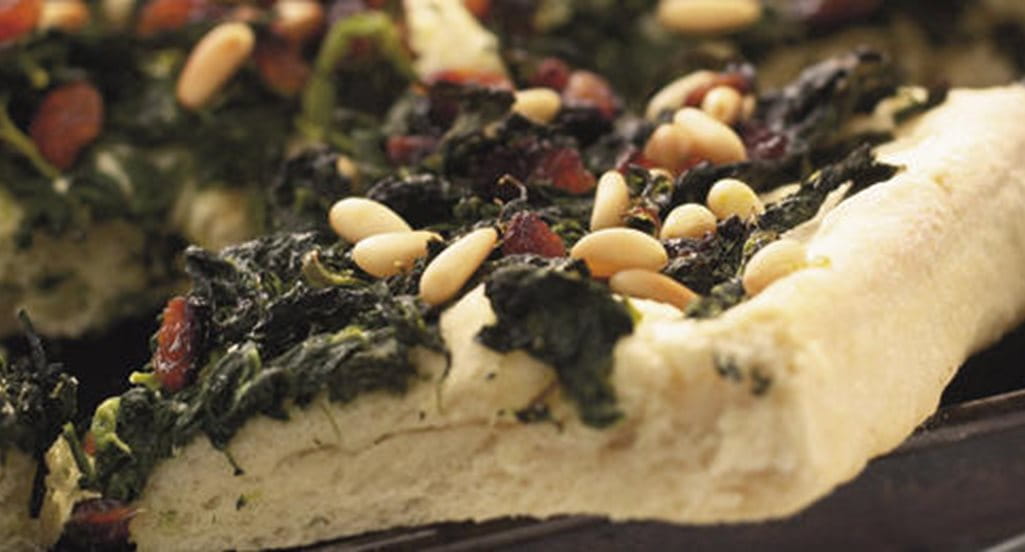 - Disponha as folhas de espinafres sobre a massa e, por cima, distribua os pinhões e as passas, previamente demolhadas em água e escorridas.