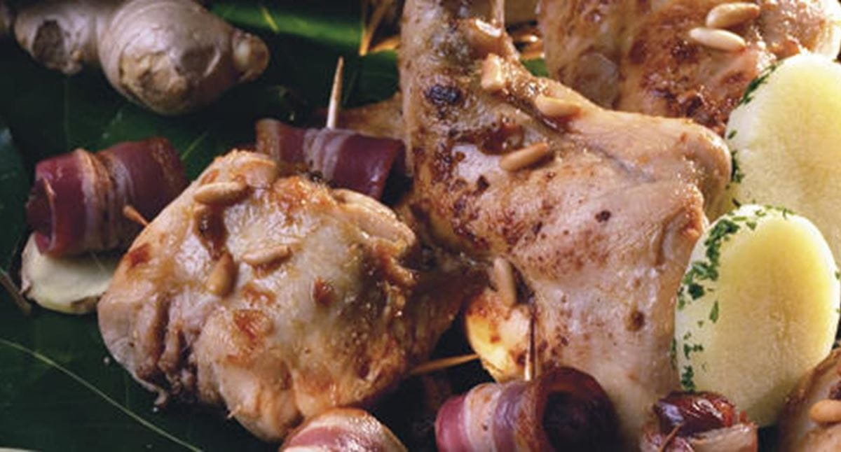 - Retire o caroço às tâmaras e enrole cada uma em meia fatia de bacon, prendendo com um palito. Junte ao coelho, regue com a aguardente, tape e deixe cozinhar até este estar macio. Antes de servir junte os pinhões.