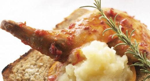 - Introduza as batatinhas e o coelho e deixe glacear, ou seja, deixe o molho aderir a toda a superfície do coelho e sua guarnição.