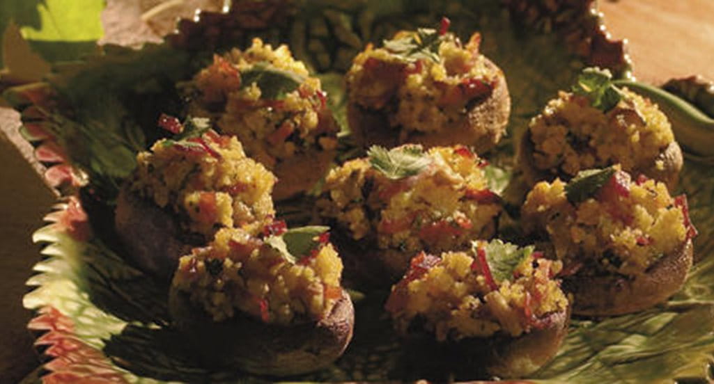 - Leve ao lume a refogar no azeite, a cebola e o alho. Adicione o presunto, os pés dos cogumelos e os pezinhos dos coentros picados, reservando as folhas. Junte a broa de milho esfarelada, deixe apurar, rectifique o tempero e recheie as copas dos cogumelos com este preparado. Rectifique o tempero.