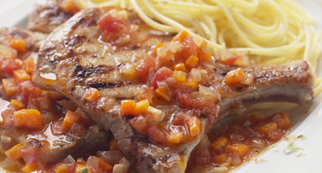 - Quando as costeletas estiverem prontas, coloque-as na travessa de serviço, borrife o molho com o vinagre, perfume a gosto com orégãos e deite sobre as costeletas.