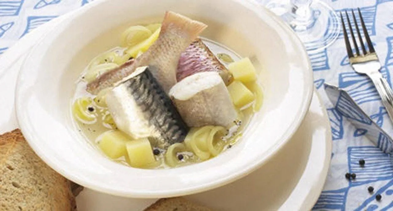 - Retire o peixe e as batatas com uma colher de ranhuras, distribua-os por 6 pratos baixos, regue com um pouco de caldo e tempere com vinagre de vinho tinto. Deite o restante caldo numa terrina.