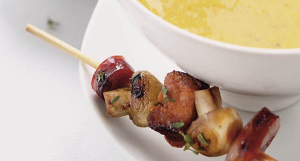 - Corte os enchidos em rodelas e enfie em espetos de madeira, alternando com os cogumelos.