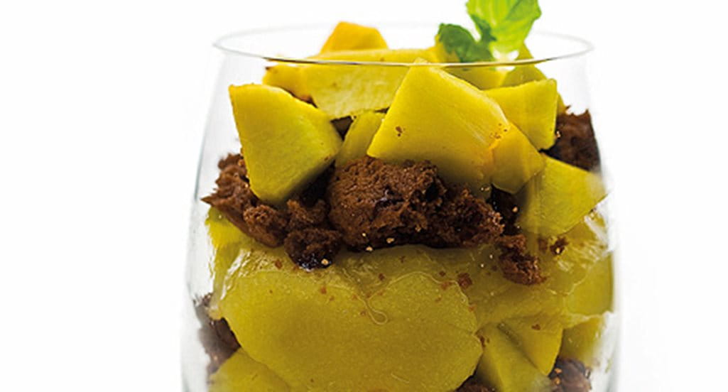 - Distribua uma colherada deste creme por 6 copos direitos baixos e largos. Por cima deite parte das bolachas grosseiramente esmagadas e pedaços de pêssego picados.