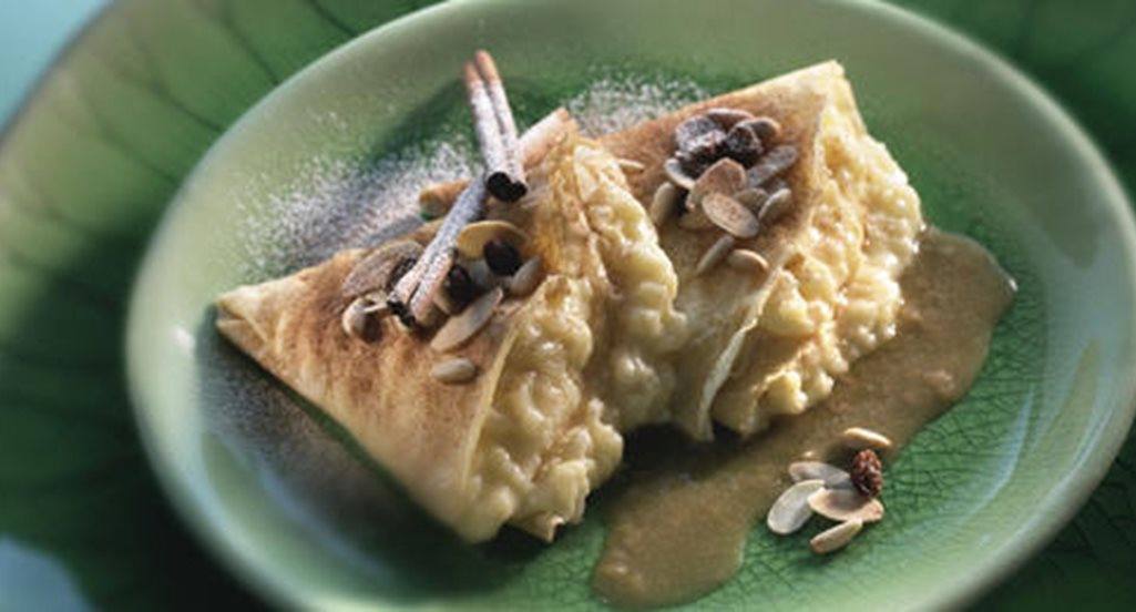 Prepare o arroz doce e os crepes de véspera; o arroz doce ficará com um sabor mais delicado e homogéneo. Pode também salpicar os crepes com uma boa colherada de frutos secos levemente torrados (pinhões, avelãs, amêndoas, nozes, etc) e passas de uva. Congele as claras que sobraram da preparação do arroz doce para utilizações futuras