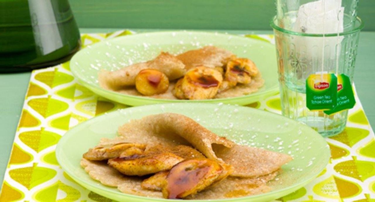 - Coloque um disco de massa numa frigideira antiaderente. Leve ao lume e deixe alourar. Volte o disco, espalhe rodelas de banana sobre metade do disco, polvilhe com açúcar e canela e dobre a parte disponível da massa sobre o recheio. Deixe aquecer um pouco e coloque no prato de serviço.