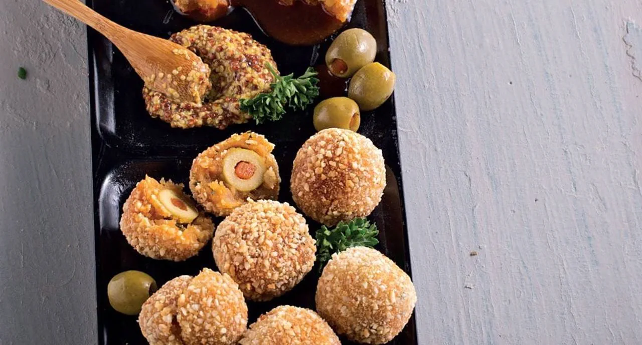 - Molde metade do preparado em pequenos croquetes e o restante em bolinhas. Introduza uma azeitona em cada bolinha e role de novo entre as mãos de modo a cobrir completamente a azeitona.