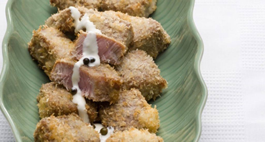 - Escorra os cubos de atum e passe-os pela clara e depois pelo coco ralado. Introduza-os no óleo quente e frite rapidamente. Retire-os com uma escumadeira e escorra sobre papel de cozinha.