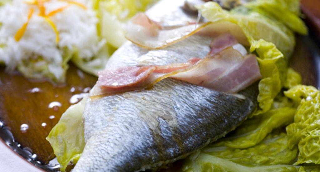 - Recheie as barrigas das douradas com a mistura e com uma faca afiada abra dois rasgos em diagonal de cada lado dos lombos das douradas. Corte as fatias de bacon em tiras e introduza-as nesses rasgos.