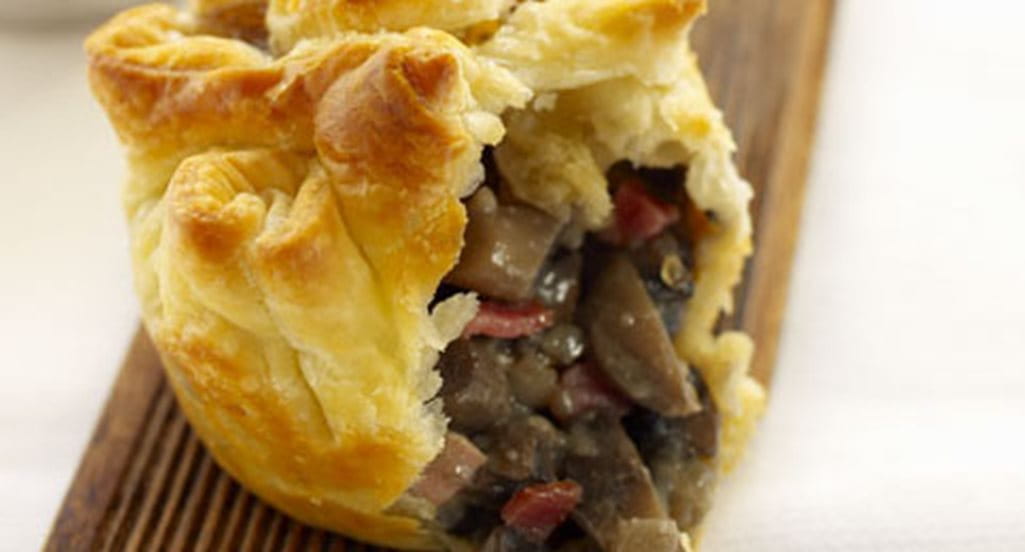 - Forre 6 formas para queques com os quadrados de massa folhada, recheie com o preparado de cogumelos e una as pontas da massa sobre o recheio.
