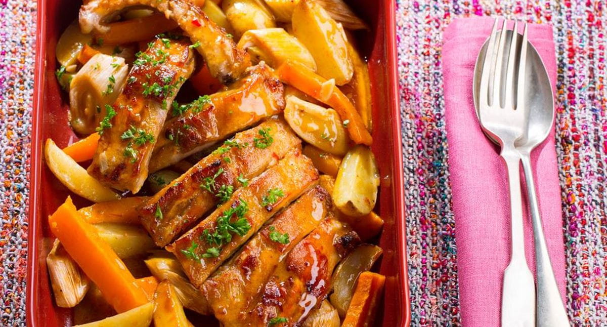 - 10.Misture os legumes preparados, salpique com uma pitada de sal e disponha-os em volta da carne.