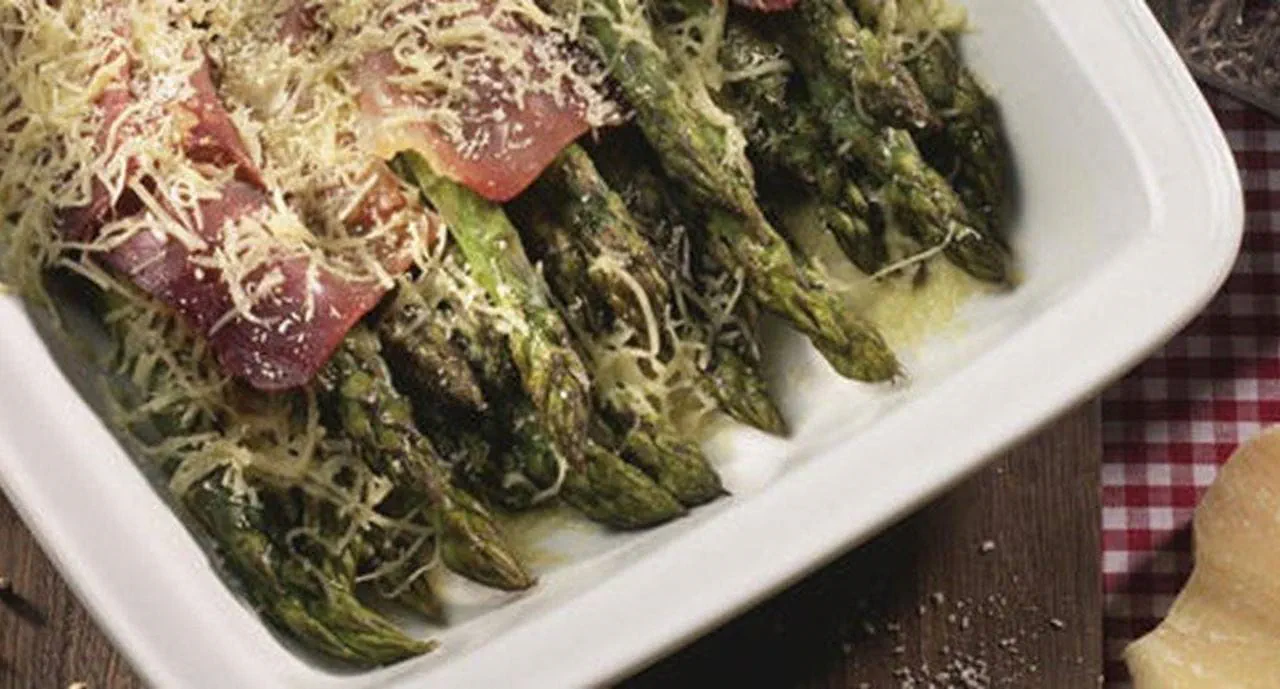 - Retire o fio aos espargos e enrole cada molhinho em 2 fatias de presunto levemente sobrepostas, deixando as pontas espigadas dos espargos de fora. Disponha-as no tabuleiro e por cima salpique com o queijo ralado em fios e com a restante margarina Vaqueiro, cortada em nozinhas. Polvilhe com o queijo parmigiano ralado na altura, e tempere com pimenta moída na ocasião. Cubra o tabuleiro com folha de alumínio e leve a cozinhar em forno médio durante 10 minutos. Retire a folha de alumínio e introduza de novo no forno por mais 5 minutos.