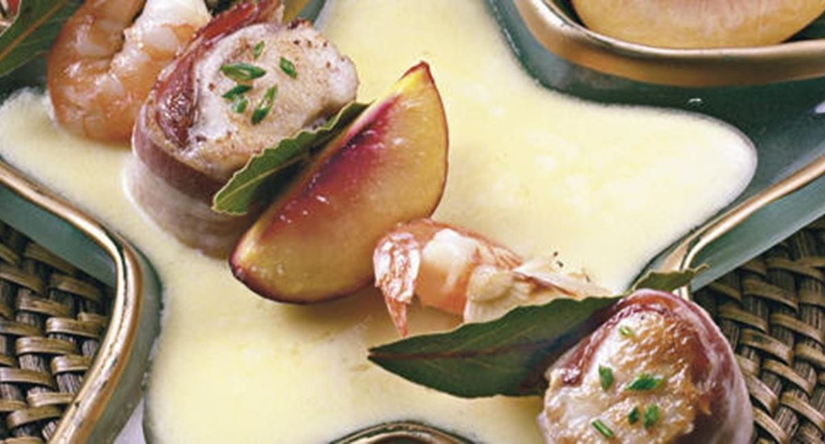 - Corte o tamboril em cubos e tempere com o sumo dos limões, raspa da casca de um deles, sal, pimenta, o óleo Vaqueiro e o cebolinho picado. Deixe marinar durante 1 hora, pelo menos, virando o peixe de vez em quando. Retire as cabeças e as cascas às gambas. Descasque as cebolas e corte-as em quartos. Lave os alperces, pele-os, corte ao meio e retire o caroço. Corte as fatias de bacon ao meio. Escorra os cubos de tamboril da marinada e enrole-os nas fatias de bacon.