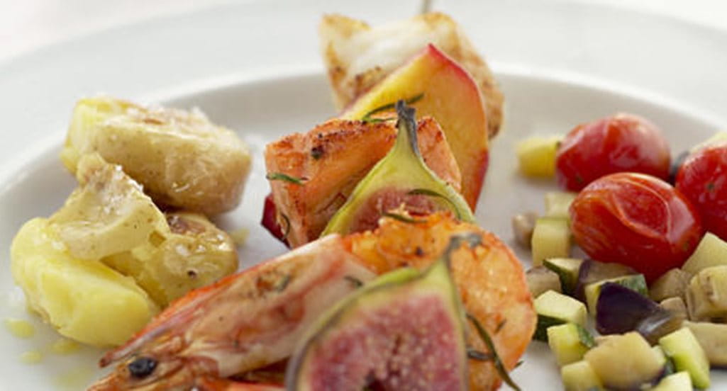 - Corte os lombos de tamboril e de salmão em cubos regulares. Tire a casca e a tripa aos camarões, mas mantenha as cabeças e os rabinhos. Lave os pêssegos e os figos e corte-os ao meio.