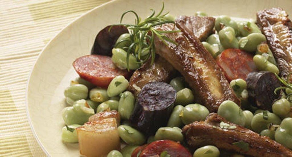 - Descasque e pique as cebolas e leve a alourar num tacho com a margarina Vaqueiro. Corte o toucinho em tirinhas, o entrecosto em bocados pequenos e o chouriçode carne em rodelas. Adicione tudo ao refogado e deixe alourar as carnes. Introduza o chouriço mouro, previamente picado com um palito e as favas. Tape o tacho e deixe suar sobre lume muito brando durante 10 minutos, agitando o tacho de vez em quando. Se for necessário junte um pouco de água quente. Introduza o ramo de coentros atado e tempere com sal, pimenta e uma pitada de açúcar. Deixe cozinhar sobre lume brando até as favas estarem tenras e junte água quente sempre que achar necessário para não deixar secar o cozinhado.