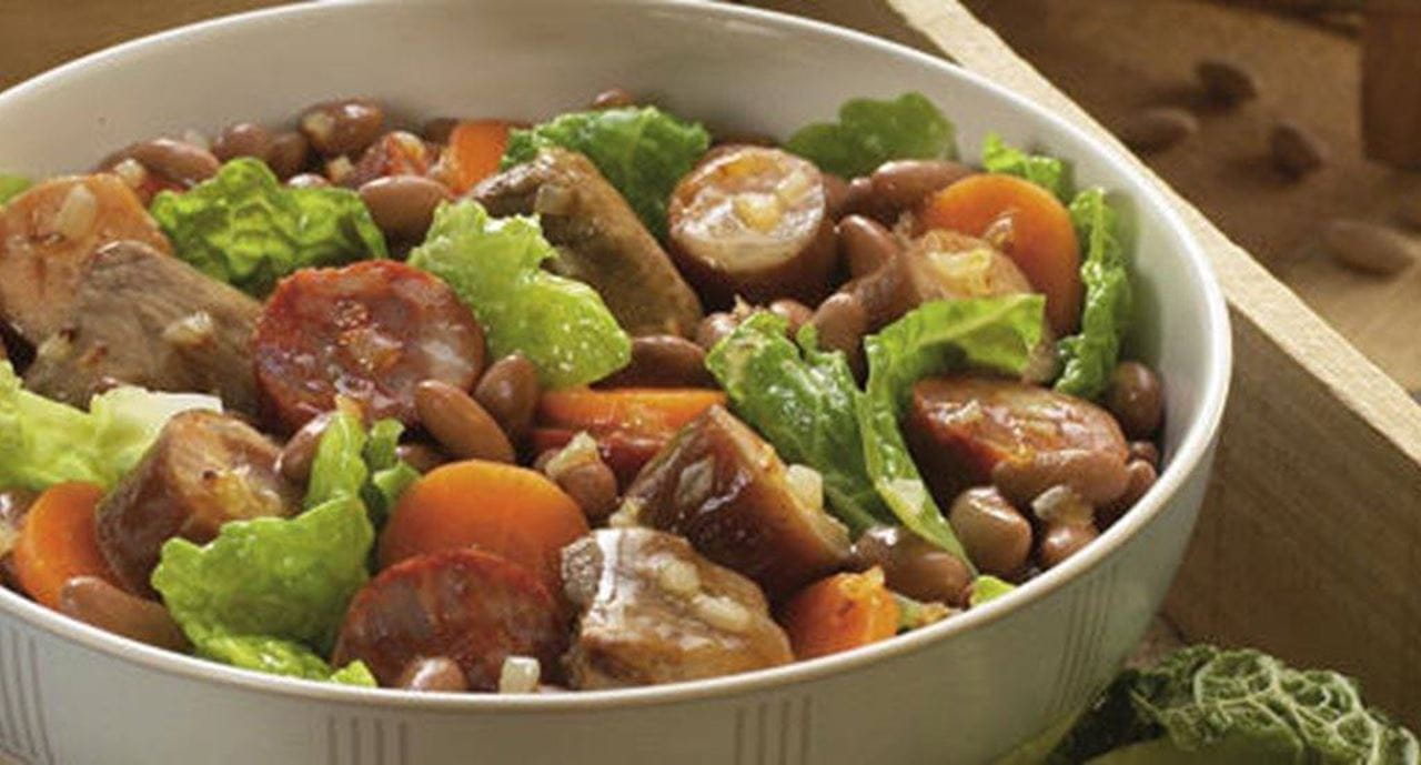 - Entretanto, descasque e pique as cebolas e leve a alourar com a margarina Vaqueiro. Junte o chouriço cortado em rodelas e a carne de porco cortada em bocados. Deixe a carne alourar de todos os lados. Adicione a cenoura, pelada e cortada em rodelas e junte o feijão cozido e respectivo caldo. Rectifique o sal e tempere com pimenta, tape o tacho e deixe apurar durante cerca de 15 minutos. Enquanto isso, separe as folhas da couve lombarda, apare os talos e lave-as muito bem em água corrente. Ripe as folhas em pedaços e junte-as ao feijão. Deixe cozer até a couve estar tenra. Pique a farinheira com um palito e coza-a à parte.