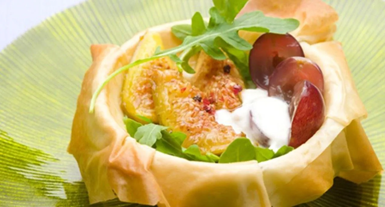 - Distribua a mistura de alfaces e rúcula pelas caixas de massa filo, por cima disponha o molho de iogurte, os figos caramelizados e os bagos de uva. Perfume com um pouco de pimenta rosa.