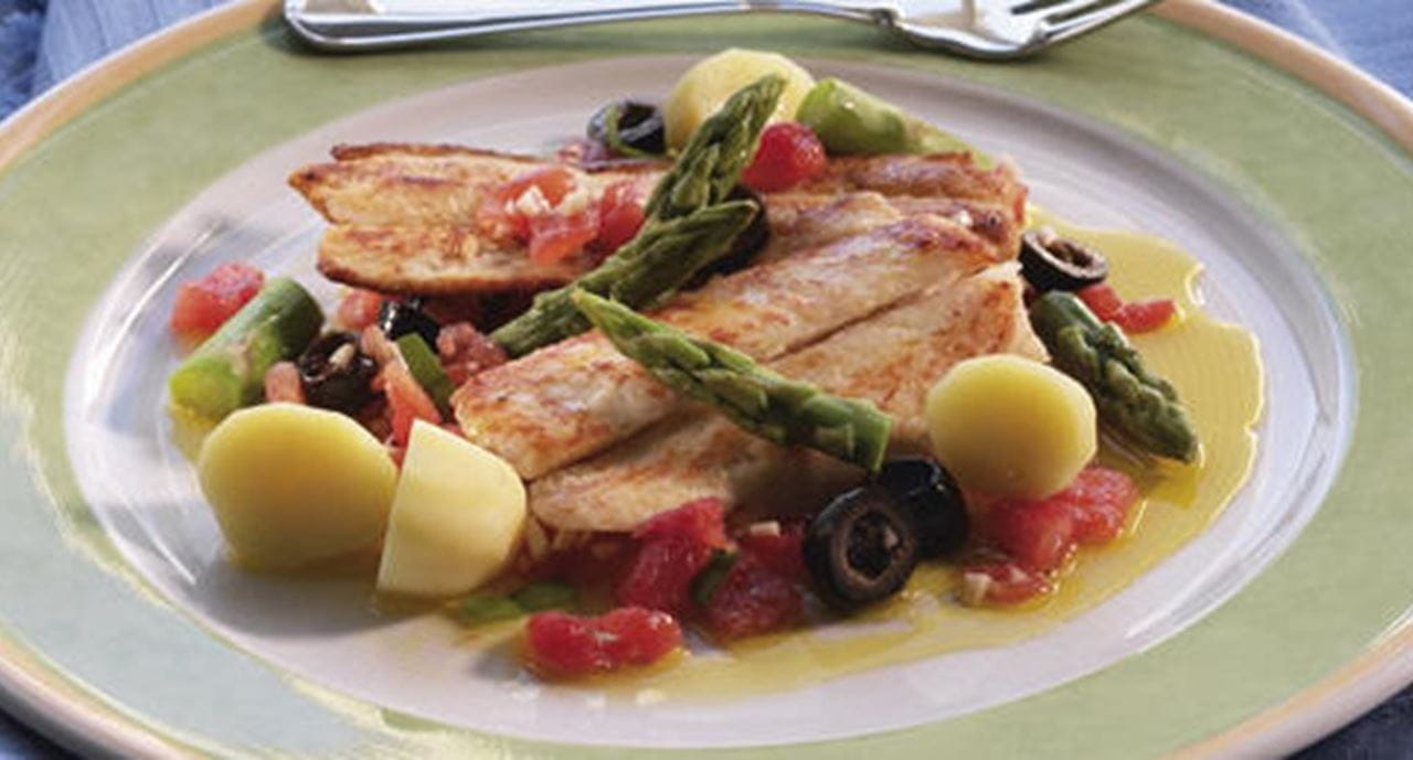 - Lave e enxugue o ramo de coentros, escolha as folhinhas e pique-as finamente. Junte à mistura de tomate e azeitonas. Sirva com os filetes de peixe e acompanhe com os espargos salteados e batatinhas cozidas.