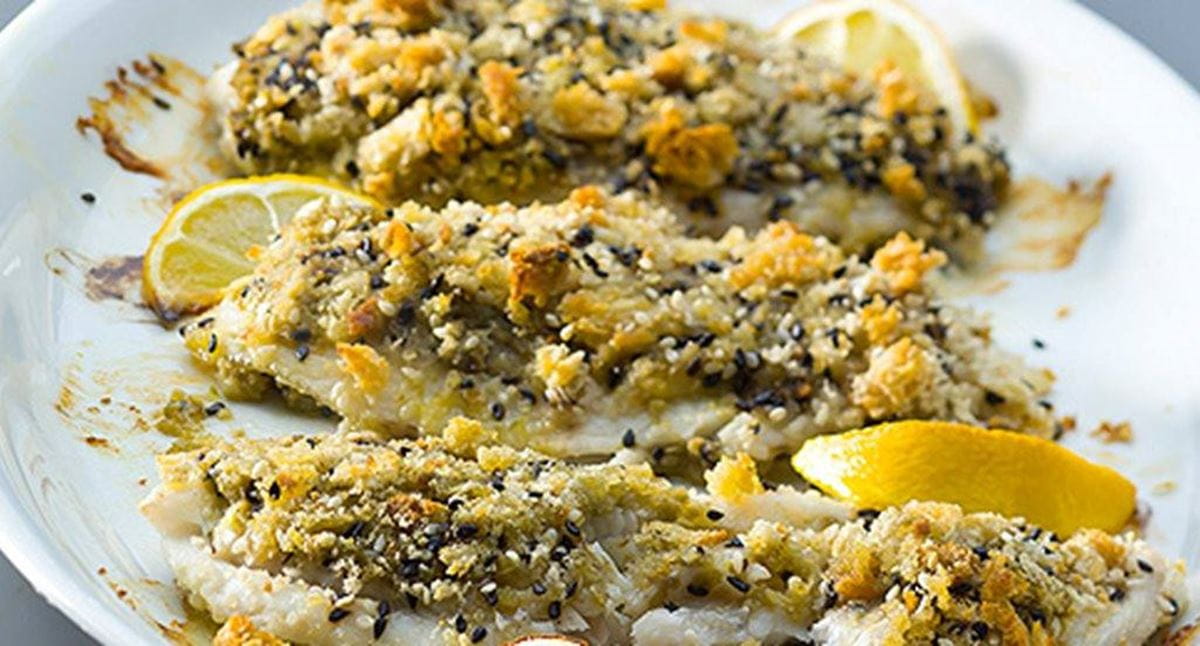 - Escorra os filetes de marinada barre-os de ambos os lados com a pasta de azeitona verde e passe-os pela mistura de pão e sésamo.
