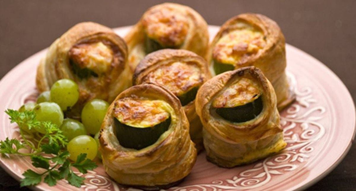 - Envolva os troncos de courgette nos quadrados de massa folhada e coloque-os sobre o tabuleiro do forno forrado com papel vegetal. Distribua o preparado de ovos e creme culinário Vaqueiro pelas courgettes e leve ao forno durante cerca de 20 minutos, até o recheio estar cozido e a massa folhada dourada e estaladiça.