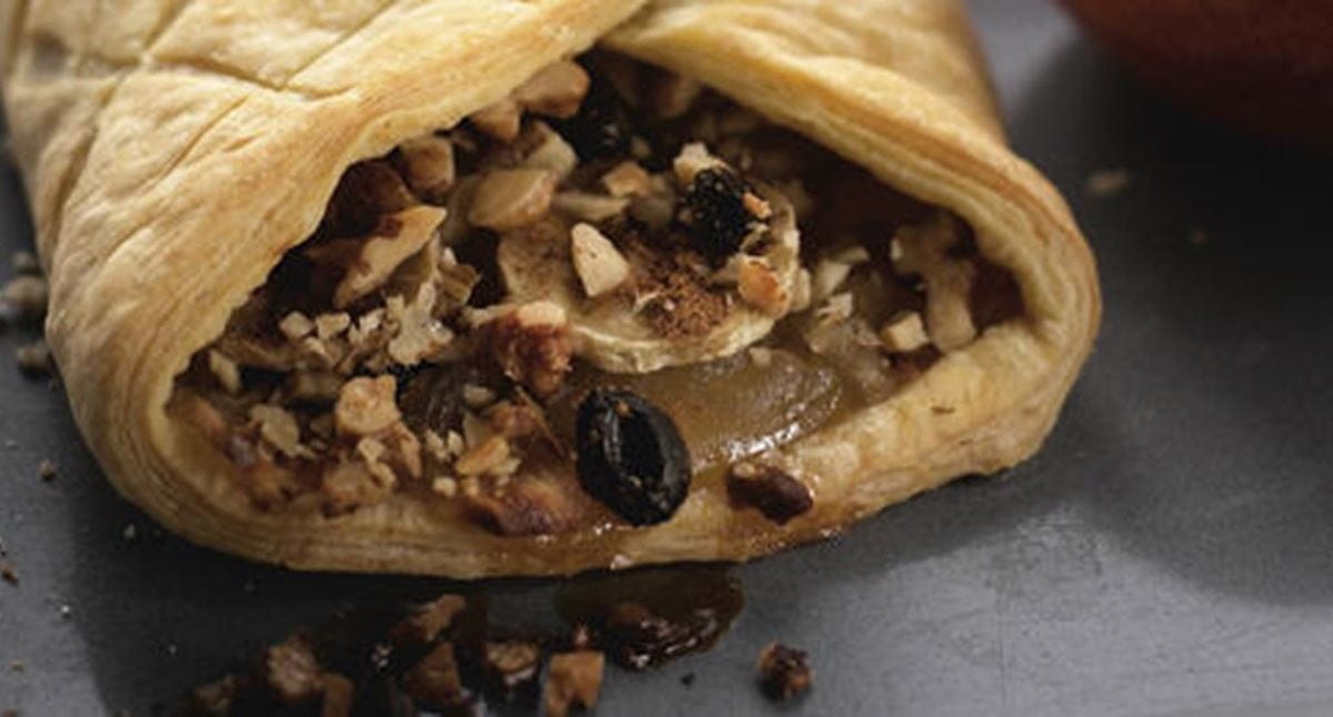 - Desenrole a massa folhada e coloque-a, com o papel, sobre o tabuleiro do forno. Pique a massa com um garfo. Numa tigela misture o doce de maçã com as nozes grosseiramente picadas e as sultanas. Se quiser surpreender, experiente misturar no recheio 1 banana, pequena e madura, cortada em rodelas.