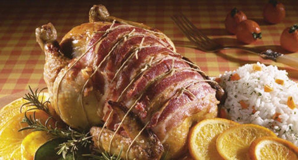 2. Esfregue o frango por dentro e por fora com sal e introduza no interior deste as duas laranjas com o cravinho. Ate as asas e as pernas do frango, envolva-o com as fatias finas de baconsegurando-as com um fio. Coloque o frango num tabuleiro regue com o sumo do limão, o vinho do Porto, o azeite e leve ao forno (preaquecido a 220º) cerca de ½ hora.