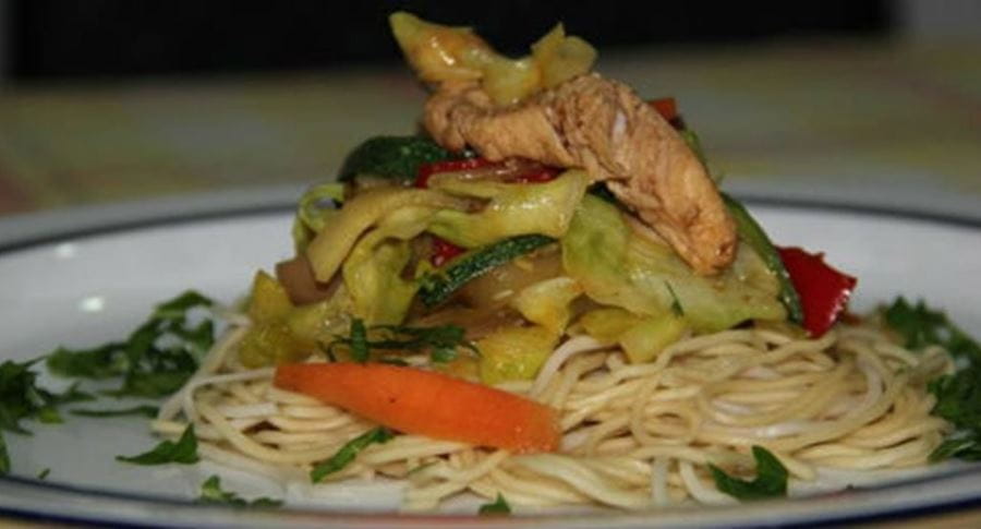 Frango exótico salteado com legumes em cama de massa chinesa