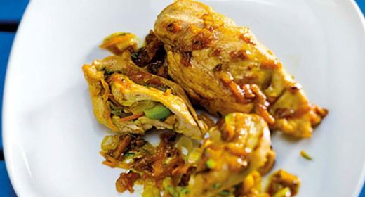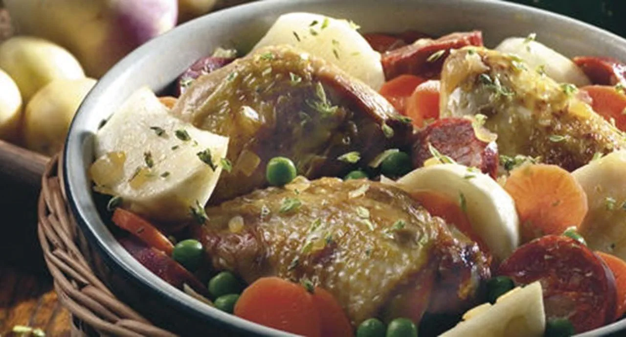 - Num tacho, aloure o frango de todos os lados na margarina Vaqueiro quente. Junte as cebolas picadas e o chouriço em rodelas. Tape e deixe cozer brandamente durante 15 minutos. Se for necessário adicione um pouco de água quente. Junte os nabinhos descascados (se forem grandes corte-os em gomos), as ervilhas e a cenoura, em rodelas. Rectifique o sal e a pimenta e deixe cozer, tapado até o frango e os legumes estarem macios.