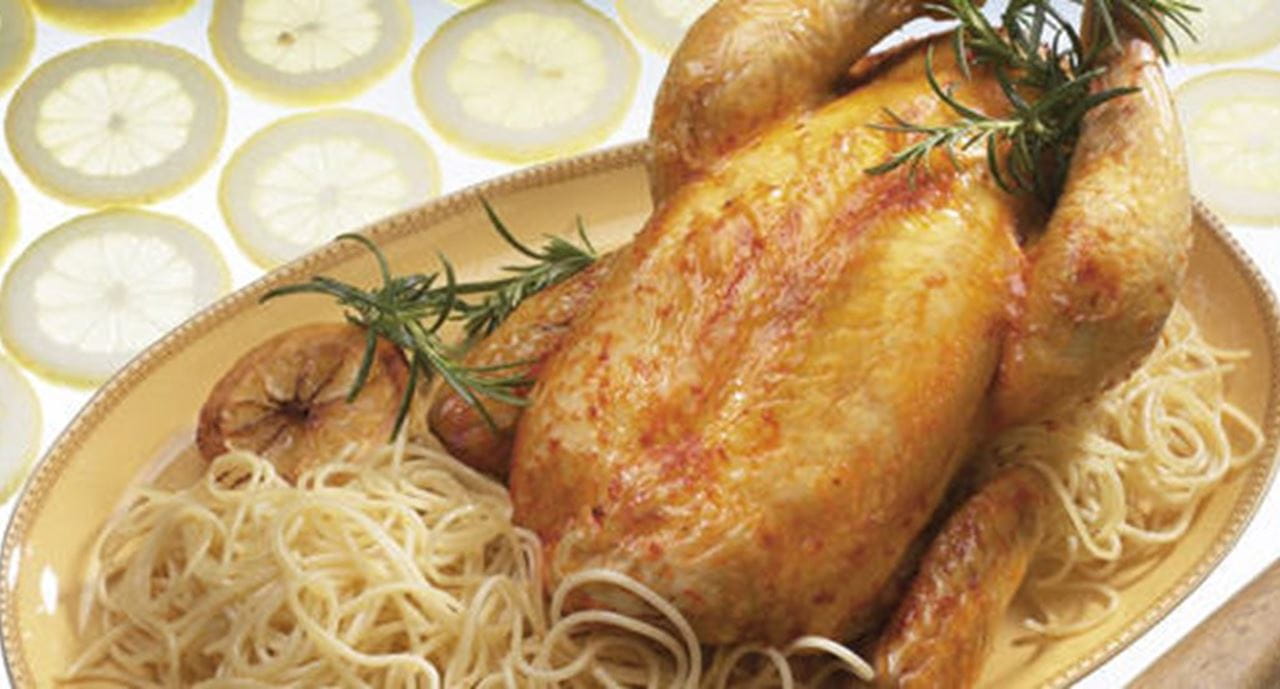 Sirva acompanhado com esparguete cozido.Antes de introduzir o limão dentro do frango, pique-o todo com um garfo, para que o sumo se liberte mais facilmente.