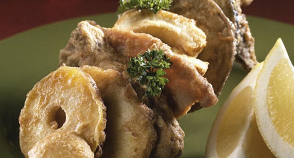 - Corte os corações de alcachofra, a beringela e as maçãs em fatias. Passe as carnes, os vegetais, as fatias de maçã e os biscoitos de amêndoa pela farinha temperada, passando-os depois pelos ovos batidos.