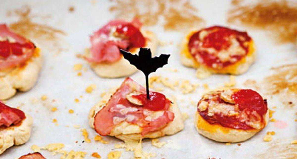 - Barre as rodelas de massa com molho de tomate, enfeite a gosto com rodelas de chourição, fiambre, salsichas, cogumelos laminados e queijo ralado em fios.