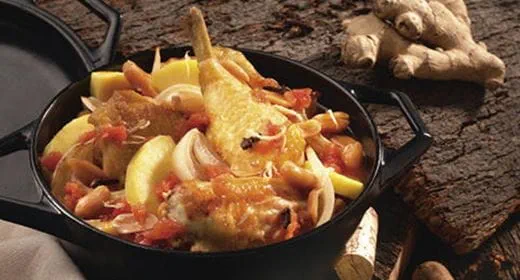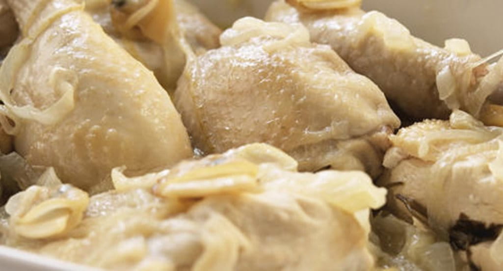 - Descasque e corte em rodelas a cebola e leve a refogar com aVaqueiro Líquida. Quando a cebola começar a alourar adicione os dentes de alho cortados em lâminas, regue com o vinho branco e junte uns pés de salsa e de coentros, atados, o cubo de caldo de galinha e um pouco de água. Deixe ferver e introduza os pedaços de frango. Tape e deixe cozer cerca de 30 minutos ou até o frango estar macio. Adicione as amêijoas e deixe retomar fervura .