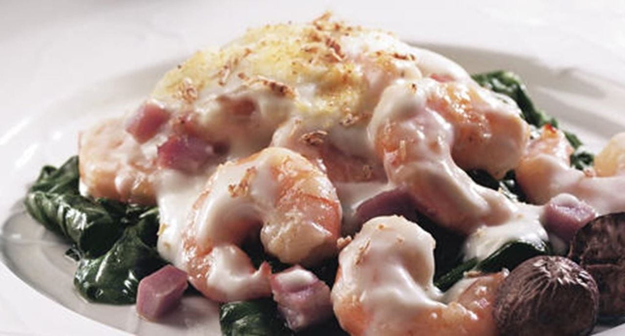 - Descasque e retire as cabeças às gambas, tempere-as com sal e leve-as alourar em metade da margarina Vaqueiro, numa frigideira larga. Retire as gambas, junte à gordura o bacon cortado em cubinhos e deixe alourar. Junte as folhas de espinafres, lavadas e bem escorridas, e deixe os espinafres murcharem. Tempere com sal e pimenta e coloque-os sobre o fundo de um tabuleiro que possa ir ao forno e à mesa. Por cima, espalhe as gambas salteadas e regue com o sumo do limão.