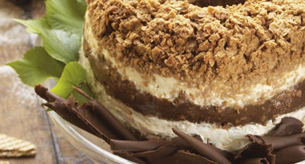 - Deite osdois cremes em camadas alternadas com a bolacha ralada numaformacomburaco e leveao congelador durante pelo menos 8 horas.