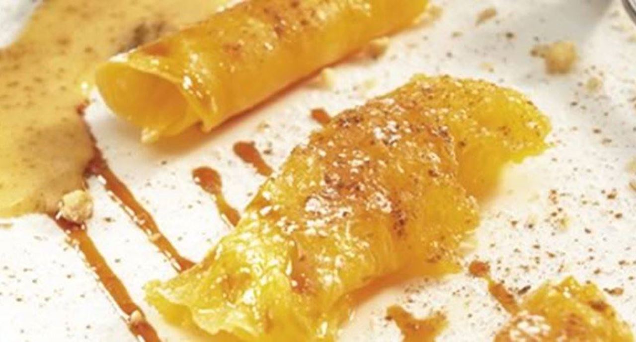 - Desenforme o gelado ou molde-o em bola e sirva cortado em fatias com as placas de ovo enroladas e o doce de ovos. Polvilhe com canela.