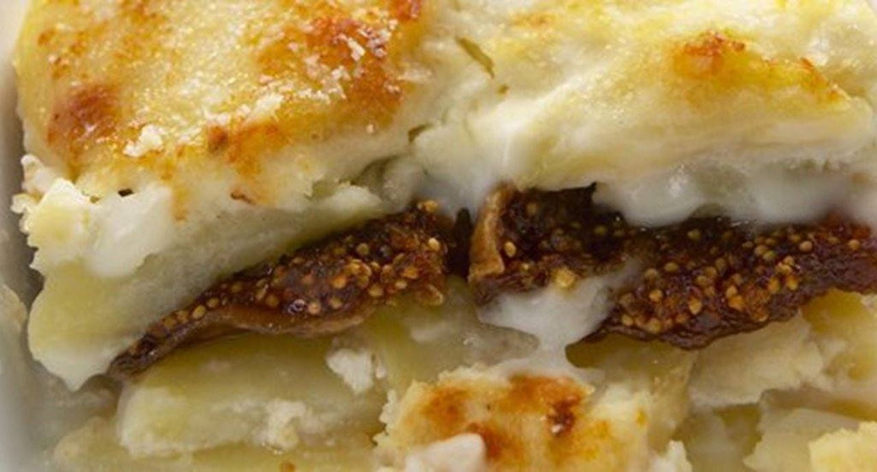 - Pincele um tabuleiro que possa ir ao forno e à mesa com Vaqueiro Líquida, cubra o fundo com uma camada de rodelas de batata, regue com natas e polvilhe com queijo parmesão. Repita as operações até chegar a meio dos ingredientes. Tire o pé aos figos e corte-os ao meio no sentido longitudinal e disponha-os sobre os ingredientes que se encontram no tabuleiro fazendo alguma pressão. Termine as camadas de rodelas de batata, natas e queijo, por esta ordem.